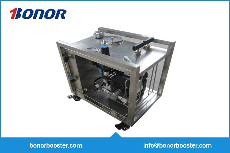 A gas-liquid booster system is a compact and easy-to-use system that integrates a gas-liquid booster pump, oil tank (or water tank), and other components within a tubular frame or enclosed casing, based on the actual needs of industrial production. The pressure regulating valve, pressure gauge, and other valves are all panel-mounted. The output pressure can be adjusted by setting the drive air pressure regulator. The pump automatically stops when the set pressure is reached and resumes operation when the pressure drops.
