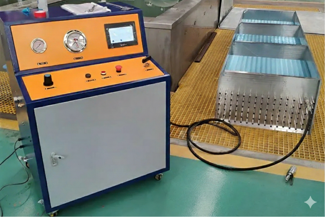 The High-Pressure Tube Expanding Machine uses compressed air as its power source and consists of two main components: a hydraulic power console and collet tooling. First, two collets are used to securely block and seal both ends of the tube to be expanded. The machine then generates high-pressure hydraulic flow, which is injected into the tube, completing the tube-to-fins expansion joint. Simply set parameters such as expansion pressure and duration on the touchscreen, and the entire expansion process will be automatically carried out by the PLC module.